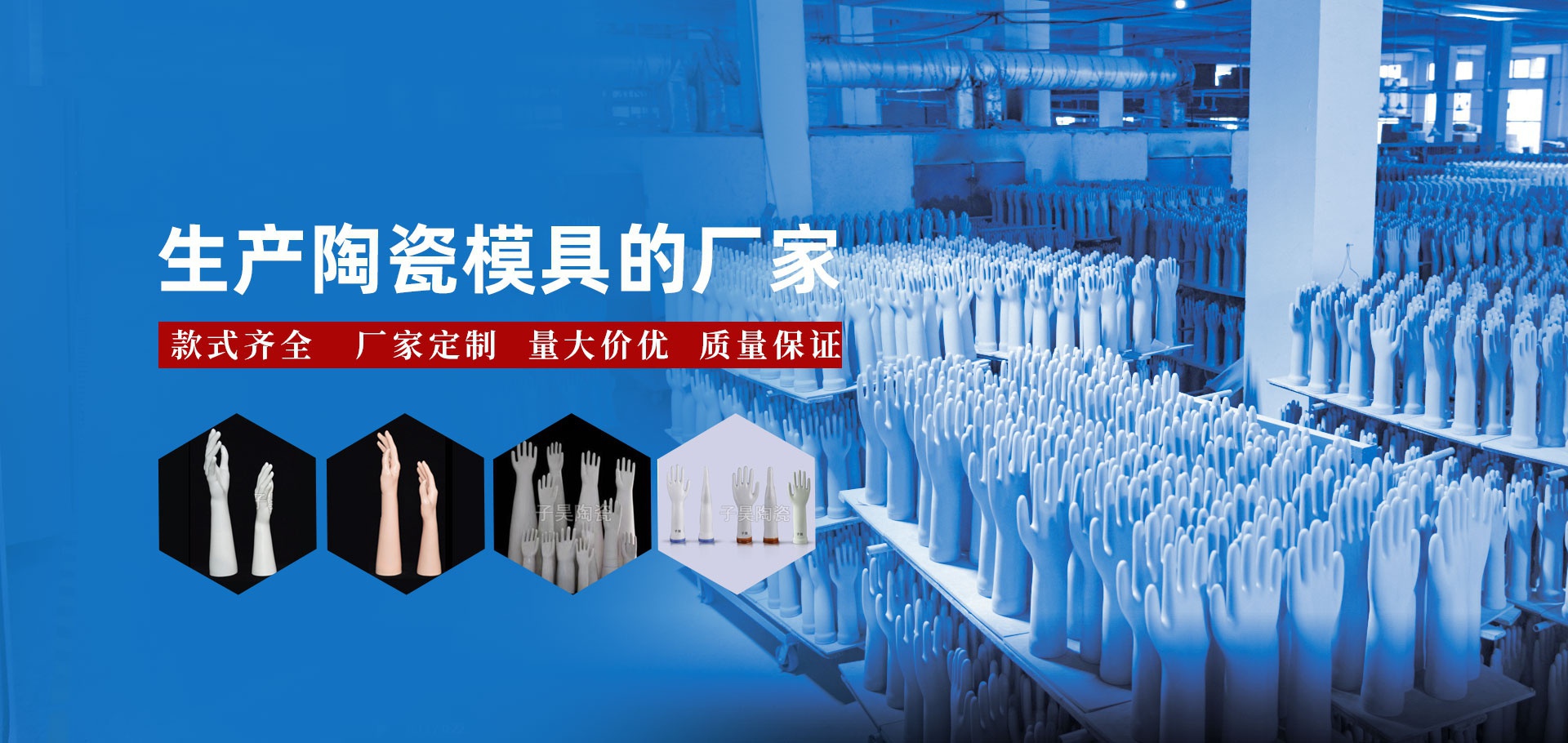 景德镇子昊陶瓷有限公司成立于2012年,公司总面积1.5万平方米,坐落于景德镇瓷都高新开发区。专业生产和定制各种陶瓷手模厂家。主要产品有:PVC手模、丁腈手模、 乳胶手模(检查 医用手模 ) 丁基手模等陶瓷手模。日产量过万,是目前江西规模较大手模生产基地。